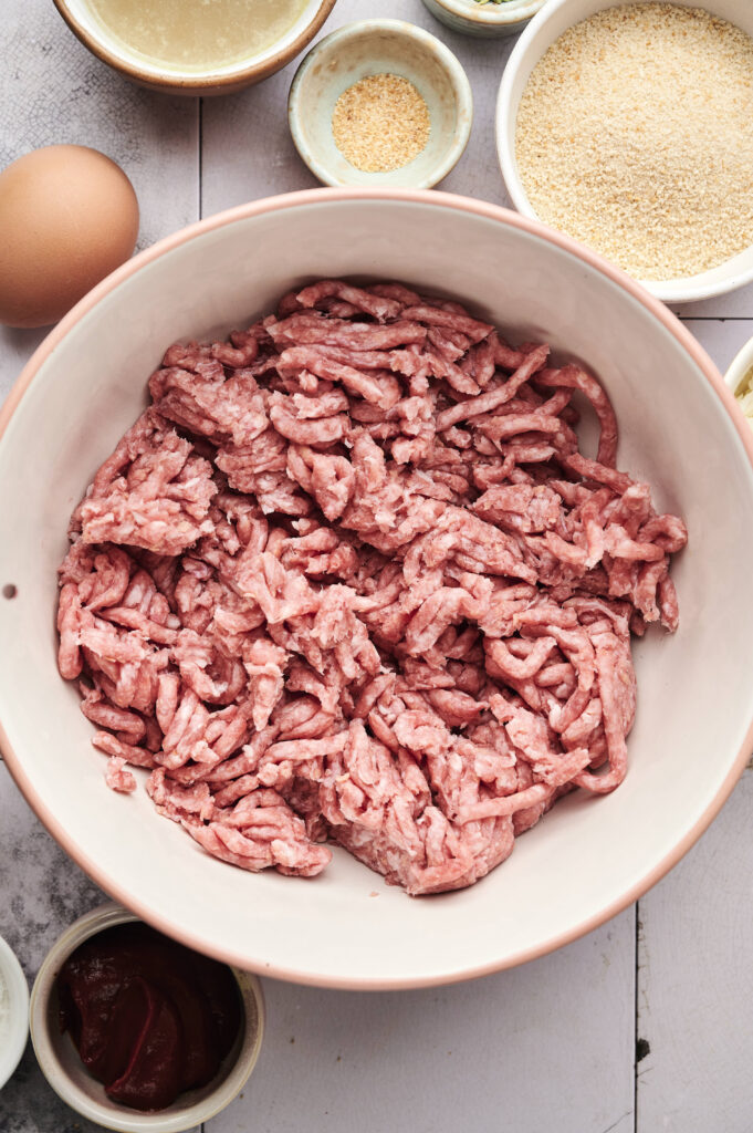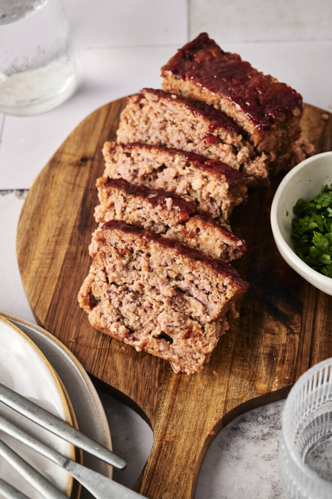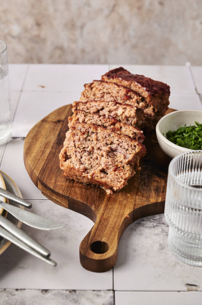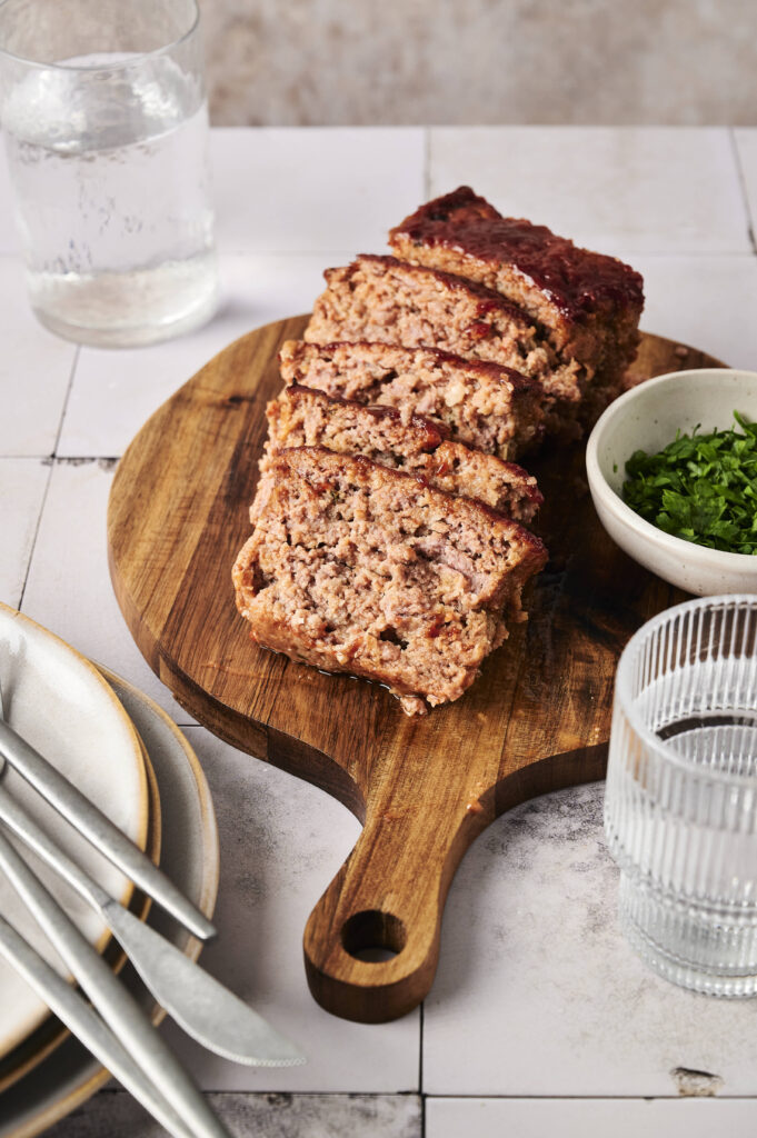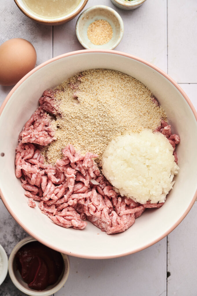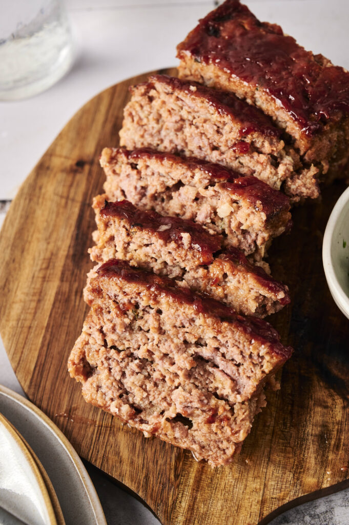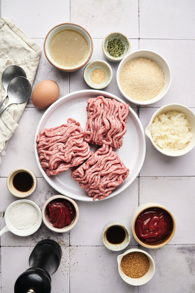 the ingredients are simple on purpose. ground beef eggs breadcrumbs onion,the magic is in ratios and method. dont overmix. use enough fat. let breadcrumbs form panade. apply glaze correctly. rest before slicing.