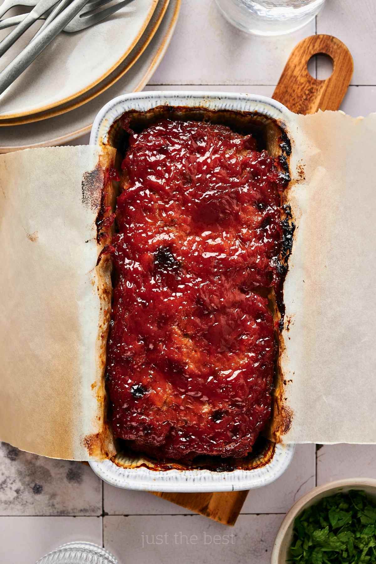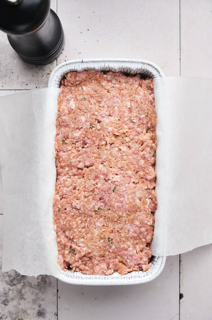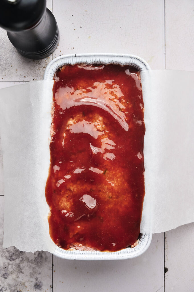 - Assemble: Spoon a few tablespoons of the sauce into the bottom of the loaf pan. Add the meatloaf mixture, pressing to shape it firmly into the pan. Top evenly with the remaining sauce.